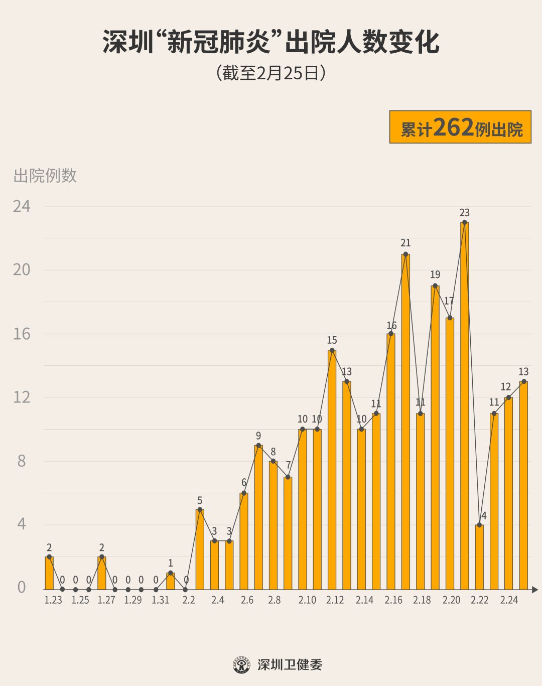 2月25日下午,經(jīng)專家組會(huì)診,深圳有13名新型冠狀病毒肺炎確診患者出院,累計(jì)達(dá)262人,連續(xù)23天有人出院。