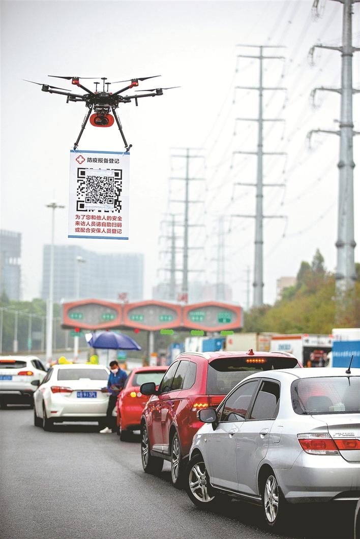 2月11日,在G94高速深圳觀瀾收費處,深圳龍華機訓(xùn)大隊無人機飛行隊的民警操作懸掛有申報二維碼的無人機在候檢的車輛間飛行。晶報記者賴犁攝