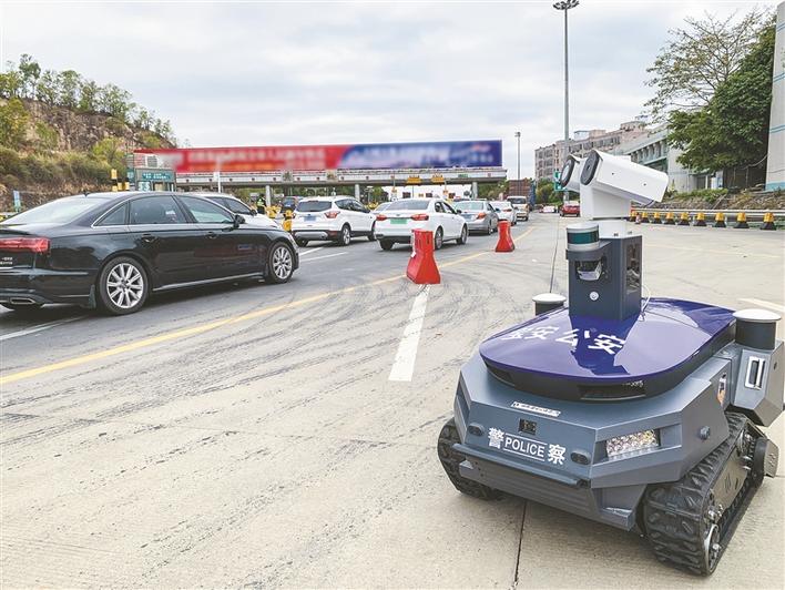 警用巡視機器人“建國”在深圳高速路口執(zhí)行巡邏任務(wù)。