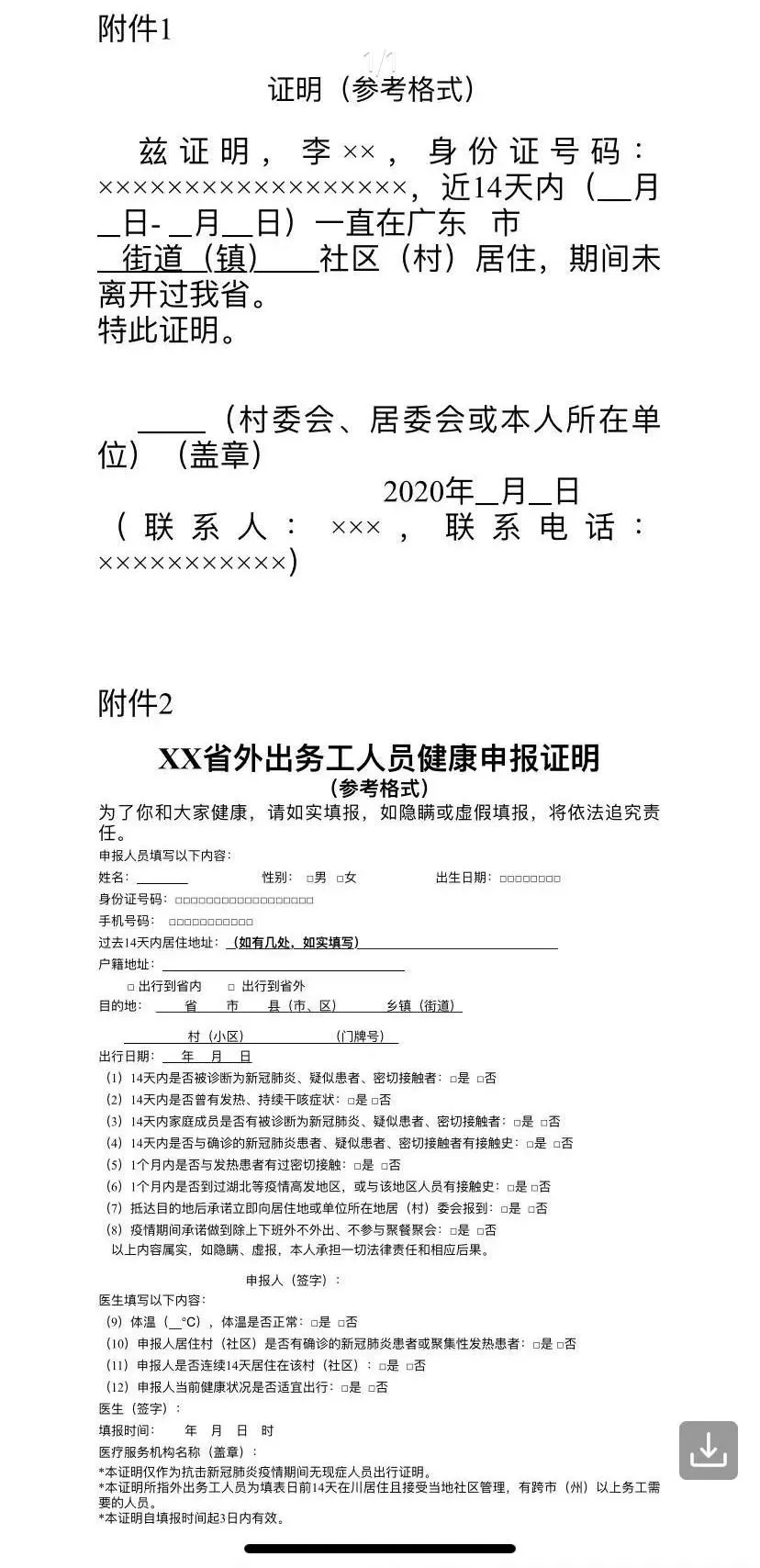 二、對(duì)持湖北省等疫情高發(fā)地區(qū)身份證來粵人員,如能提供中國(guó)移動(dòng)、中國(guó)電信和中國(guó)聯(lián)通發(fā)布的個(gè)人軌跡證明信息,證明本人14天內(nèi)未離開過廣東、未到過疫情高發(fā)地的,可到社區(qū)(居委或村委)或本人所在單位申領(lǐng)證明(見附件1)。