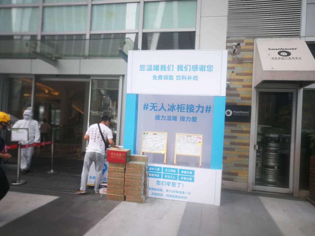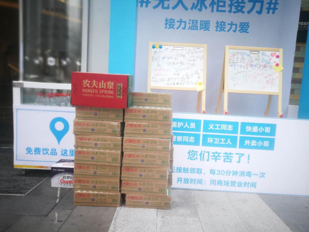 該名工作人員告訴記者,如果冰柜里的飲品沒了,還會有專門的工作人員對冰柜進行巡查,一旦發(fā)現(xiàn)冰柜空了,就會及時補貨?;顒娱_始后,商場內許多商家如永輝超市、喜茶、艾薯夫婦、Lady M等都加入了進來。當天中午,必勝客送過來的免費快餐也很受歡迎。
