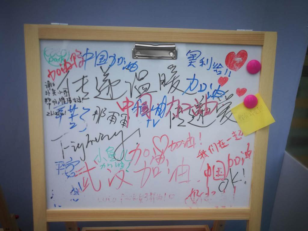 記者留意到,無人冰柜旁,一張碩大的告示牌上寫著"無人冰柜接力,接力溫暖接力愛",告示牌的下方,還特意標注"醫(yī)護人員、警察同志、義工同志、環(huán)衛(wèi)工人、快遞小哥、外賣小哥,你們辛苦了"的字樣。告示牌前,還架著兩塊白板,上面寫滿了諸如"武漢加油""傳遞溫暖""一起看櫻花"等市民的真情告白。告示牌旁,擺放著二十幾箱晨光仙草涼粉,以及成箱的百歲山、農(nóng)夫山泉等品牌的礦泉水,冰柜里還有可口可樂以及一些涼茶飲料。柜體上,清晰地標注了"免費飲品,這里領取。"