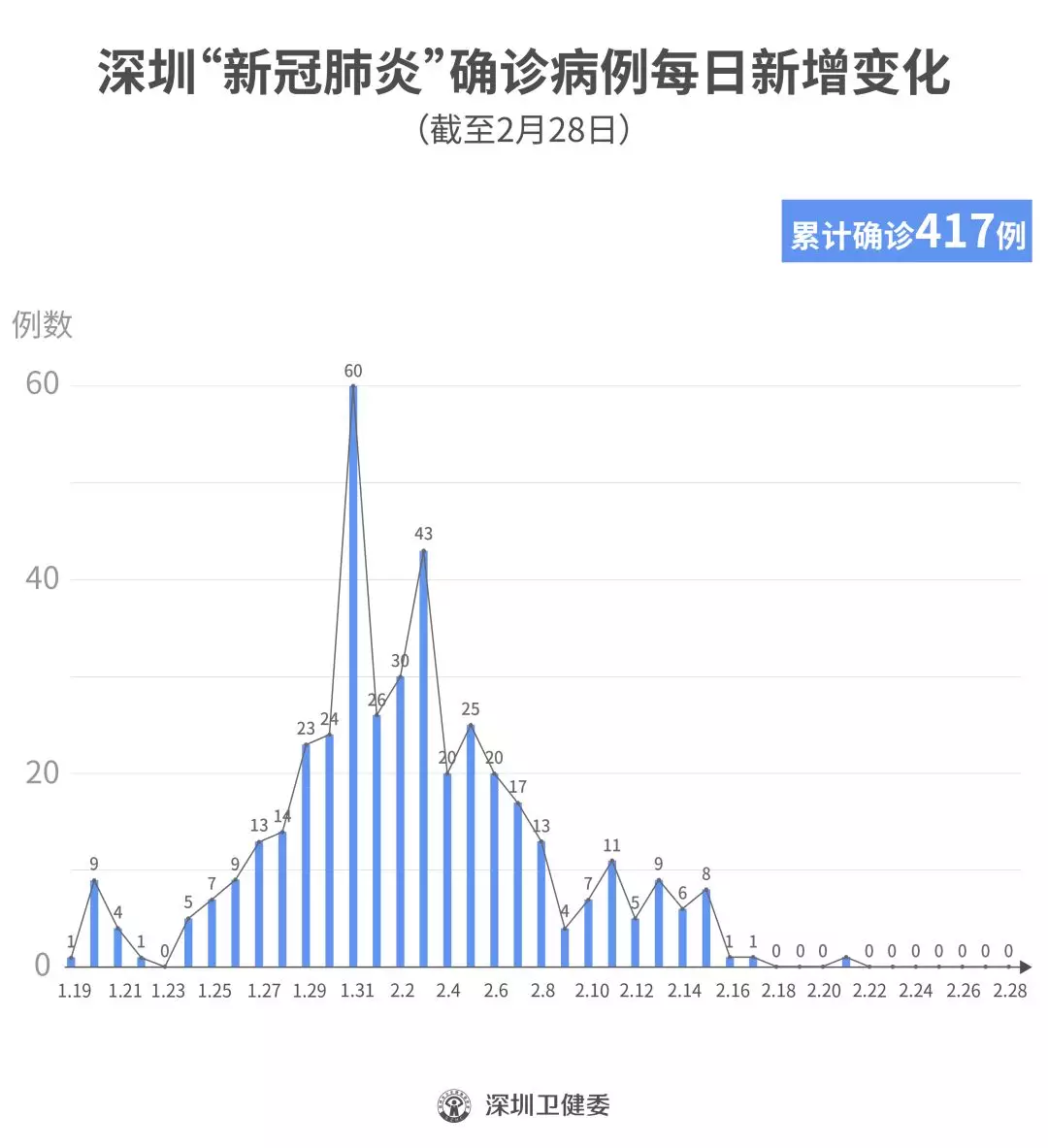 截至2月28日24時,深圳累計報告“新冠肺炎”確診病例417例。2月28日當(dāng)天全市無新增確診病例,當(dāng)天出院病例18例(從26日起不再公布出院個案)。