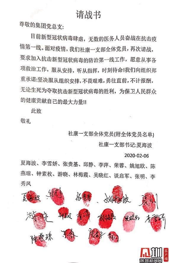 見(jiàn)圳客戶端·深圳新聞網(wǎng)訊(記者 董非)“讓黨旗在防控斗爭(zhēng)第一線高高飄揚(yáng)。”新冠肺炎疫情發(fā)生以來(lái),南山區(qū)醫(yī)療集團(tuán)總部黨員勇當(dāng)先鋒,以實(shí)際行動(dòng)踐行初心使命,涌現(xiàn)出眾多感人故事,展現(xiàn)了共產(chǎn)黨員的風(fēng)采與擔(dān)當(dāng)。 疫情發(fā)生后,南山區(qū)第一時(shí)間制定出臺(tái)了《黨建引領(lǐng)疫情防控工作五項(xiàng)行動(dòng)方案》,南山區(qū)委書記王強(qiáng)號(hào)召全體黨員,發(fā)揮黨組織的戰(zhàn)斗堡壘作用和黨員的先鋒模范作用,全力保障人民群眾生命安全和身體健康,讓黨旗在防控疫情斗爭(zhēng)第一線高高飄揚(yáng),堅(jiān)決打贏疫情防控人民戰(zhàn)爭(zhēng)、總體戰(zhàn)、阻擊戰(zhàn)。南山區(qū)醫(yī)療集團(tuán)總部積極響應(yīng),黨建引領(lǐng)下的防控抗疫工作有序科學(xué)地展開(kāi)。 今年1月底,深圳市南山區(qū)區(qū)委授旗成立南山醫(yī)療系統(tǒng)黨員突擊隊(duì)。南山區(qū)醫(yī)療集團(tuán)總部緊急組建了防控新冠肺炎應(yīng)急突擊隊(duì),僅一天內(nèi)區(qū)醫(yī)療集團(tuán)就共有169人完成第一批應(yīng)急突擊隊(duì)報(bào)名,其中黨員過(guò)半數(shù)。 疾風(fēng)知?jiǎng)挪荩一馃捳娼?。一封封?qǐng)戰(zhàn)書閃電匯聚到黨總支,召即來(lái),來(lái)能戰(zhàn),戰(zhàn)能勝,沖鋒在前就是擔(dān)當(dāng)?shù)淖蠲姥堇[;一位位黨員迅速入隊(duì)黨員突擊隊(duì),他們重溫入黨誓言,在黨旗下實(shí)踐著醫(yī)者仁心、人間大愛(ài);一份份入黨申請(qǐng)書紛沓而來(lái),特殊時(shí)期經(jīng)受特殊考驗(yàn),一批優(yōu)秀的醫(yī)護(hù)人員頁(yè)主動(dòng)向黨組織靠攏。鏗鏘的語(yǔ)言、堅(jiān)定的決心、舍我的擔(dān)當(dāng),是南山區(qū)醫(yī)療集團(tuán)總部廣大黨員逆行而上、抗擊疫情的堅(jiān)定決心和必勝信心。 最美逆行黨支部,積極請(qǐng)戰(zhàn)敢擔(dān)當(dāng) “我是共產(chǎn)黨員,我請(qǐng)戰(zhàn)!愿為戰(zhàn)勝疫情全力以赴!”這是南山區(qū)醫(yī)療集團(tuán)總部一支部13名黨員和2名入黨積極分子聯(lián)名撰寫的《請(qǐng)戰(zhàn)書》(節(jié)選)。 面對(duì)新冠肺炎疫情,一支部黨員在夏海波支部書記夏海波的帶領(lǐng)下,在發(fā)熱門診、發(fā)熱患者預(yù)檢分診、社區(qū)“三位一體”排查等工作中,積極發(fā)揮共產(chǎn)黨員戰(zhàn)斗在一線、沖鋒在一線的模范帶頭作用,為戰(zhàn)勝新冠肺炎疫情全體黨員積極主動(dòng)請(qǐng)戰(zhàn),并向集團(tuán)黨總支遞交了請(qǐng)戰(zhàn)書。 社康一支部全體黨員的請(qǐng)戰(zhàn)書 一個(gè)個(gè)紅手印,令人淚目,彰顯著南山區(qū)醫(yī)療集團(tuán)總部白衣天使們逆行而上的使命擔(dān)當(dāng)和責(zé)任意識(shí)。 一支部書記夏海波說(shuō),“成為疫情防控工作第一線發(fā)展黨員,是面對(duì)疫情充分發(fā)揮黨員先鋒作用的具體實(shí)踐。此次請(qǐng)戰(zhàn),將更加激勵(lì)他們我們?cè)诮窈蟮墓ぷ魈貏e是近期防疫防控工作中,以黨員的標(biāo)準(zhǔn)嚴(yán)格要求自己,發(fā)揮黨員先鋒模范作用。同時(shí),也會(huì)對(duì)全院全體員工產(chǎn)生積極引領(lǐng)、鼓舞作用,以更飽滿的斗志投入防疫防控工作。” 老黨員重溫入黨誓詞,面對(duì)黨旗表決心 “我宣誓:我志愿加入中國(guó)共產(chǎn)黨……”這是一次特別的宣誓。接到組織號(hào)召后,社康二支部的老黨員鐘達(dá)宏和吳麗娉,對(duì)著黨旗,以重溫入黨誓詞的方式,不忘黨員初心,牢記使命,積極沖鋒在前,誓要打贏防控狙擊戰(zhàn)。 社康二支部的老黨員鐘達(dá)宏和吳麗娉,對(duì)著黨旗,重溫入黨誓詞,誓要打贏防控狙擊戰(zhàn) 面對(duì)來(lái)勢(shì)洶洶的疫情,南山區(qū)醫(yī)療集團(tuán)總部的黨組織和黨員干部不但沒(méi)有被嚇倒,反而激起了他們昂揚(yáng)的戰(zhàn)斗意志和飽滿的工作熱情。 “我宣誓,我自愿加入抗擊新型冠狀病毒肺炎疫情防控工作隊(duì)伍,責(zé)任上肩,聽(tīng)黨指揮,服從命令,科學(xué)應(yīng)對(duì),恪盡職守,努力守護(hù)轄區(qū)居民健康,堅(jiān)決打贏疫情防控攻堅(jiān)戰(zhàn)!”守土有責(zé)、守土擔(dān)責(zé)、守土盡責(zé),所有社康中心的黨員干部將筑牢抗疫的基層防線,誓要守護(hù)轄區(qū)居民的生命健康。 社康二支部黨員在黨旗下宣誓努力守護(hù)轄區(qū)居民健康 艱難時(shí)刻主動(dòng)請(qǐng)戰(zhàn),夫妻雙雙奮戰(zhàn)一線 1月26日,南山區(qū)醫(yī)療集團(tuán)總部下發(fā)關(guān)于組建防控新型冠狀病毒感染肺炎應(yīng)急突擊隊(duì)報(bào)名的通知。除了得到集團(tuán)黨員們的積極響應(yīng)之外,各個(gè)支部涌現(xiàn)出一波遞交入黨申請(qǐng)書的小高潮。 李婧是社康支部的一名全科醫(yī)生,一直在社康醫(yī)院中心從事全科醫(yī)療工作,戰(zhàn)“疫”的號(hào)角吹響,李婧第一時(shí)間參戰(zhàn),在所有抗疫時(shí)期入黨人員里第一個(gè)遞交了手寫入黨申請(qǐng)書。 李婧醫(yī)生的手寫入黨申請(qǐng)書 起初,她所在的蔚藍(lán)海岸社康中心考慮到李婧的愛(ài)人是深圳市公立醫(yī)院急診科醫(yī)生其愛(ài)人是深圳市某公立醫(yī)院的急診科醫(yī)生,疫情發(fā)生以來(lái)一直堅(jiān)守在崗位