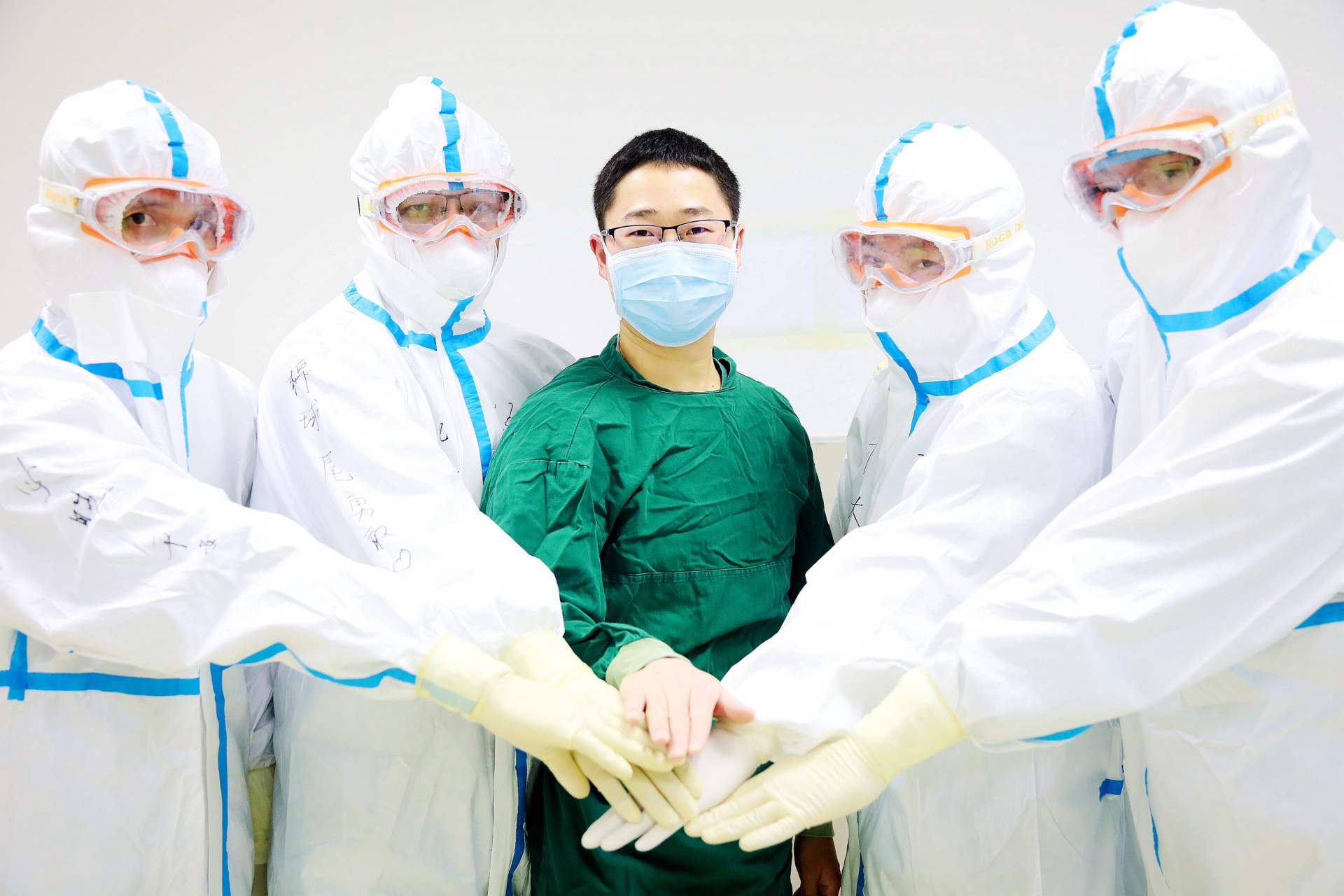 “四小金剛”與珠海中醫(yī)院重癥監(jiān)護(hù)科的戰(zhàn)友蘇文平(中)在進(jìn)入戰(zhàn)位前合影。