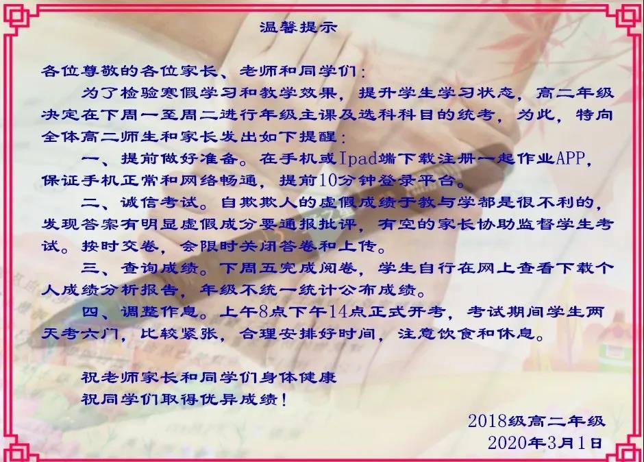 為了提高考試的可信度,考前各班級還進(jìn)行了誠信教育,讓學(xué)生明白誠信考試的重要性以及自欺欺人的危害,并發(fā)動(dòng)居家的家長積極配合監(jiān)考??记埃瑢W(xué)校也向老師學(xué)生和家長發(fā)了提示,提醒網(wǎng)上考試注意事項(xiàng)。