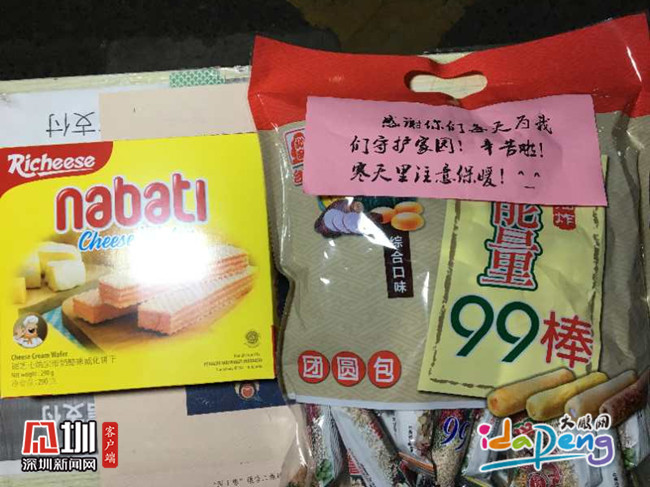 2月18日晚上,一輛奔馳車停在歐新?lián)峡c(diǎn),車上下來一名女士,放下一大包零食,說了句“辛苦了”轉(zhuǎn)身就走了……零食上還貼著一張便條:“感謝你們每天為我們守護(hù)家園!辛苦啦!寒天里注意保暖!”