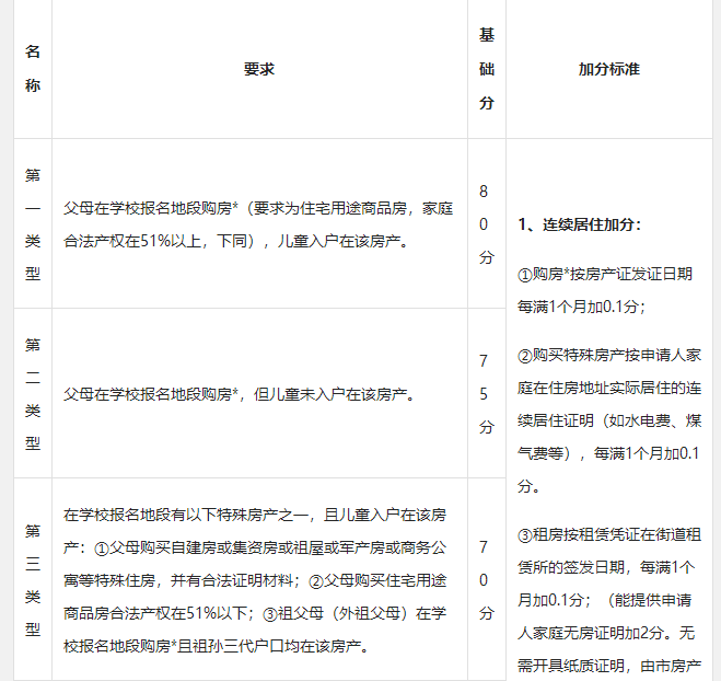 租房:父母、祖父母、外祖父母或法定監(jiān)護人在申請學校學區(qū)內(nèi)租房且能提供《房屋租賃憑證》或《公共租賃房合同》,按簽發(fā)日期每滿一個月加0.1分,其他類住房不積分。