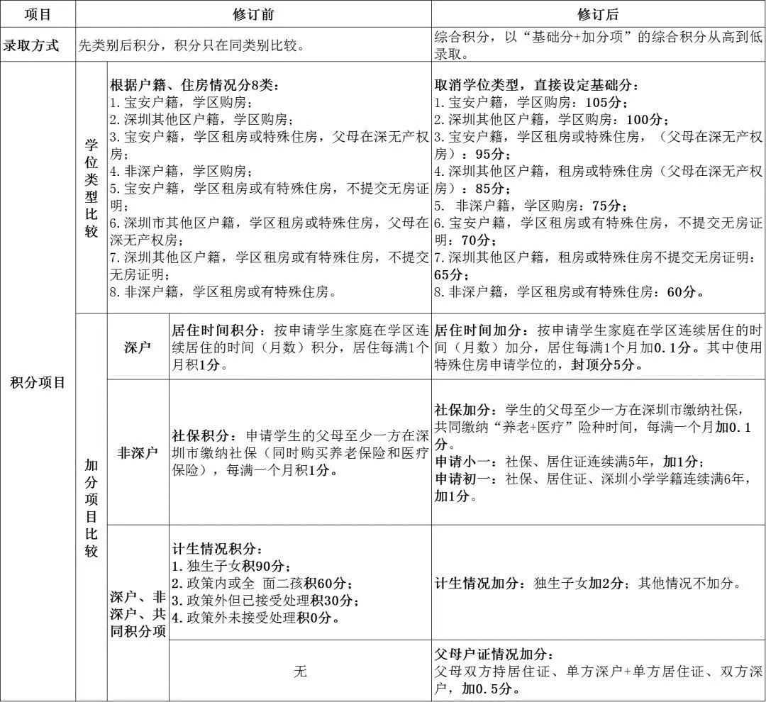 取消"非深戶籍可以以父母戶籍遷入深圳的時間計算積分"和"多子女就讀同所學校情況加分"兩項加分項;