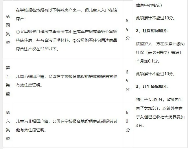 此外,"寶安戶籍,學區(qū)自購商品房"、"深圳其他區(qū)戶籍,學區(qū)自購商品房"、"寶安戶籍,無房租房"、"深圳其他區(qū)戶籍,無房租房"、"非深戶購房"、"寶安戶籍,有房租房"等情況分別在原有基礎(chǔ)分上另加5分。