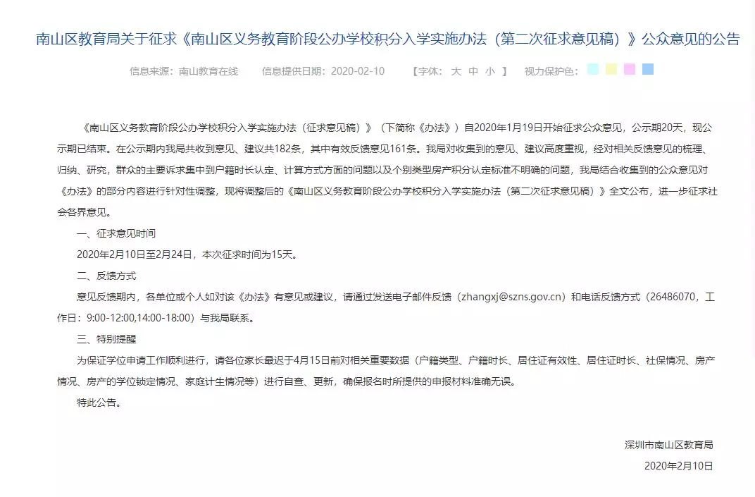1月19日,南山區(qū)教育局第一次征求意見發(fā)出后,共收集到關(guān)于積分算法調(diào)整的反饋意見182條,并于2月10日第二次發(fā)布《南山區(qū)義務教育階段公布學校積分入學實施辦法》征求意見稿(以下簡稱《意見》),根據(jù)《意見》內(nèi)容,擬調(diào)整2020年積分入學辦法。