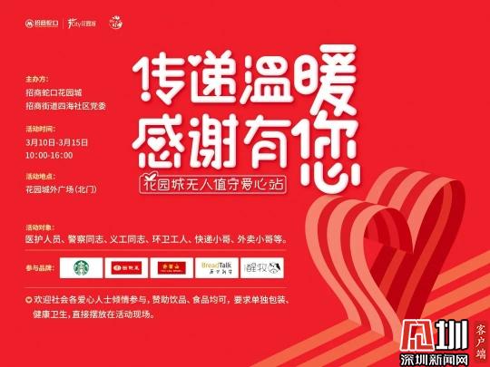 見圳客戶端·深圳新聞網(wǎng)訊(記者 王志明)他們奔波勞累,保障我們生活的秩序與安全他們勇敢逆行盡力守護(hù)城市的正常運轉(zhuǎn):醫(yī)護(hù)人員、警察同志、社區(qū)工作人員、義工同志、環(huán)衛(wèi)工人、快遞小哥、外賣小哥……今天的招商街道,多了一道靚麗的風(fēng)景線。 為了向這群最可愛的人表達(dá)我們的感恩、感動,招商街道四海社區(qū)黨委攜手招商蛇口花園城,共同開啟“無人值守愛心站”公益活動,每天提供上千份愛心食品免費領(lǐng)取,感謝在這座城市里那些不斷奔波守護(hù)著大家生活的平凡英雄們。 活動時間:3月10日至3月15日 活動地點:花園城外廣場 活動對象:醫(yī)護(hù)人員、警察同志、社區(qū)工作人員、 義工同志、環(huán)衛(wèi)工人、快遞小哥、外賣小哥等 除了星巴克、面包新語、面點王、許留山、醒牧等商家熱心公益傾情參與此次公益活動,花園城的許多員工也自發(fā)的采購起來,抱著一份份愛與尊敬時刻補貨,用自己微小的力量幫助著逆行者們。 花園城無人值守愛心站活動時間為3月10日至15日,持續(xù)6天,歡迎社會愛心人士傾情參與食品贊助,所提供物品采用單獨包裝、健康衛(wèi)生,直接擺放在活動現(xiàn)場即可。 春暖花開,山河無恙,人間皆安。待疫情結(jié)束,我們定會溫暖相遇在這座鮮花簇?fù)淼某鞘欣铩?/p>