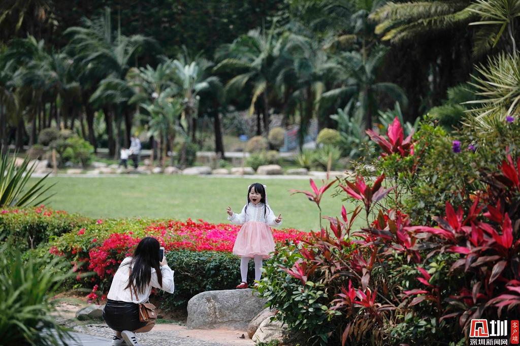 蓮花山公園一角,鮮花盛開,一位家長正為她的孩子拍照。
