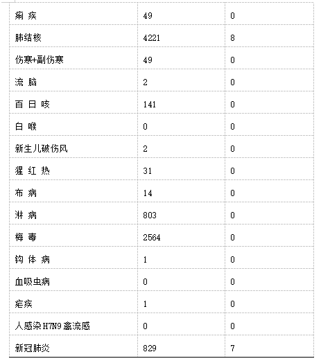 其中,甲類傳染病無報告,乙類傳染病甲類管理的新冠肺炎報告病例829例。乙類除傳染性非典型肺炎、脊髓灰質炎、人感染高致病性禽流感、狂犬病、炭疽、乙腦、白喉、血吸蟲病、人感染H7N9禽流感無發(fā)病、死亡報告外,其余18種傳染病均有病例報告。