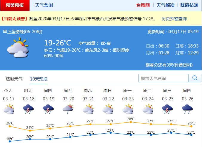 見圳客戶端·深圳新聞網(wǎng)2020年3月17日訊 深圳17日回暖增濕,18-19日有雷陣雨。17日可見陽光,早晚有輕霧,19-26℃;18-19日多云到陰天,有雷陣雨局部大雨;20-23日溫暖濕潤,早晚有輕霧或霧。