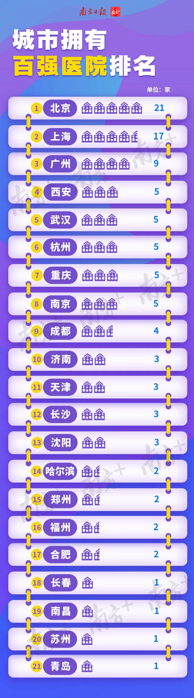 南方經(jīng)濟(jì)智庫梳理后發(fā)現(xiàn),全國排名前100的醫(yī)院中,47所被北京、上海、廣州囊括。前10個城市包攬幾乎總數(shù)80%的百強(qiáng)醫(yī)院。