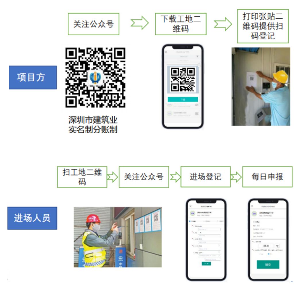 市場建設(shè)單位應(yīng)關(guān)注深圳市建筑業(yè)實名制分賬制微信公眾號,獲取本工地的微信二維碼,并將工地二維碼張貼至工地公示區(qū)域。施工人員每日進場前測溫后,掃碼申報個人測溫結(jié)果和健康狀況。