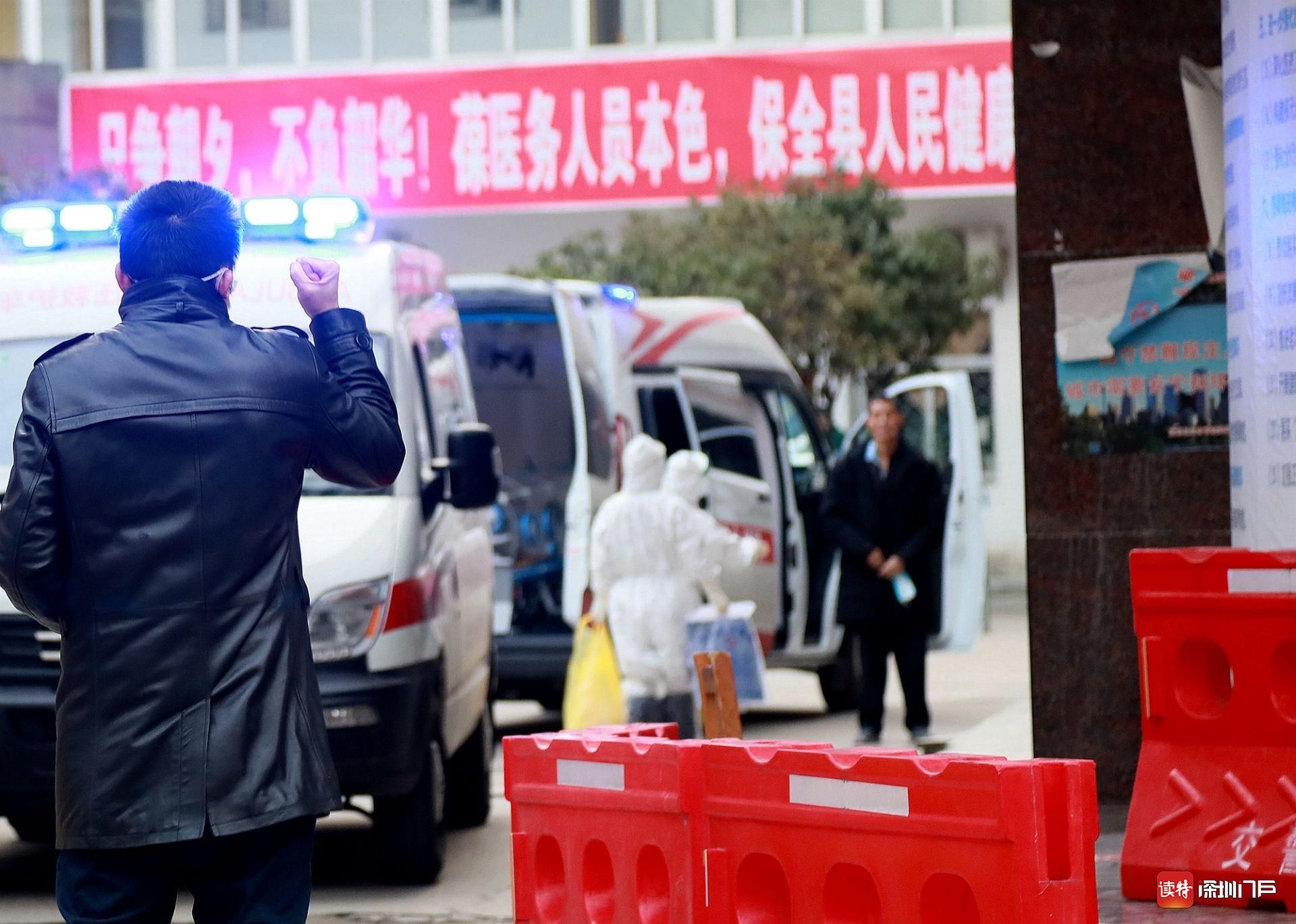 2月29日,監(jiān)利縣中醫(yī)院,一位重癥患者即將轉(zhuǎn)往荊州救治?;颊叩膬鹤勇?dòng)嵹s來,遠(yuǎn)遠(yuǎn)地向父親舉起拳頭,高喊“加油”。
