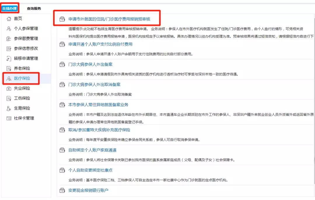 點擊“在線辦理”,按照指引選擇“醫(yī)療保險”;點擊“申請市外就醫(yī)的住院/門診費用報銷預審核”;