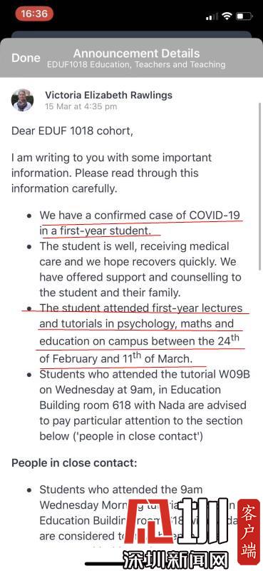 澳大利亞悉尼大學(xué)出現(xiàn)確診患者,圖為校方郵件,紅線處是確診學(xué)生的情況以及參加過的校內(nèi)活動(dòng)軌跡。