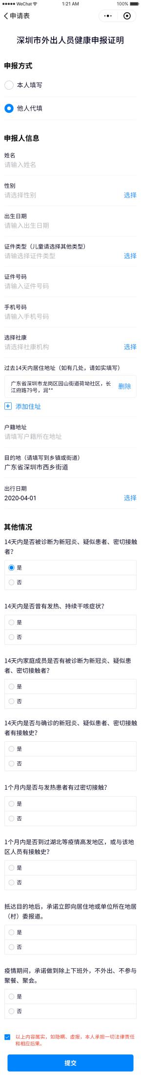 在具體操作上,市民可關注“深圳衛(wèi)健委”官方微信或“社康通”微信小程序,點擊“外出人員健康證明”,按要求填寫相關個人信息,選擇就近的社康中心以及出行目的地和出行時間,并選擇是否14天內有過發(fā)熱、干咳,是否與新冠肺炎確診患者接觸等。在填寫完畢后,便可提交。
