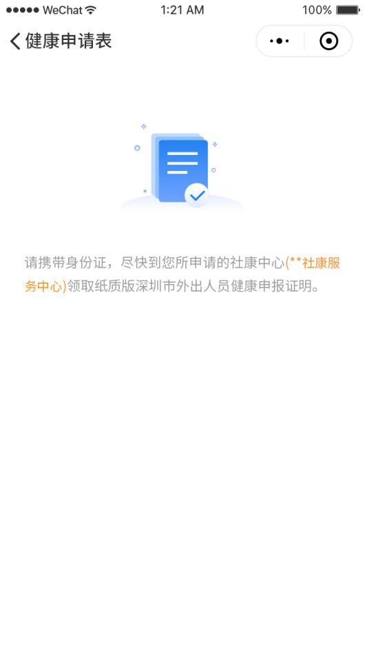 完成提交后,市民須攜帶手機和身份證,在工作時間前往選擇的社康中心預檢分診臺,展示行蹤自查行程卡、“深i您健康碼”,其中行蹤自查行程卡可在預檢分診臺掃描二維碼查詢。此外,在測量體溫并檢查有無發(fā)熱、咳嗽等呼吸道癥狀后,便可開具加蓋社康機構公章的《深圳市外出人員健康申報證明》。
