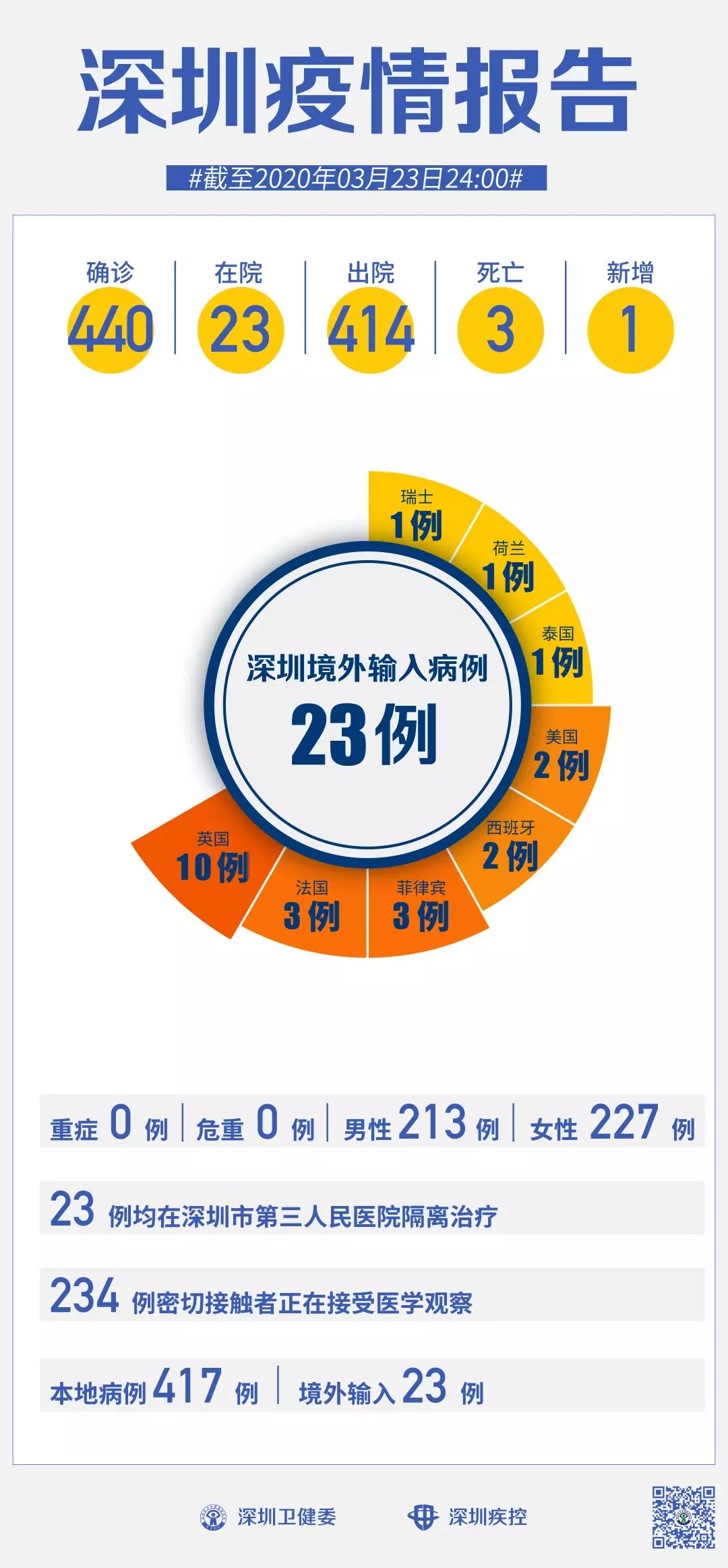 截至3月23日24時,深圳累計報告“新冠肺炎”病例440例。3月23日當(dāng)天新增1例,出院1例。