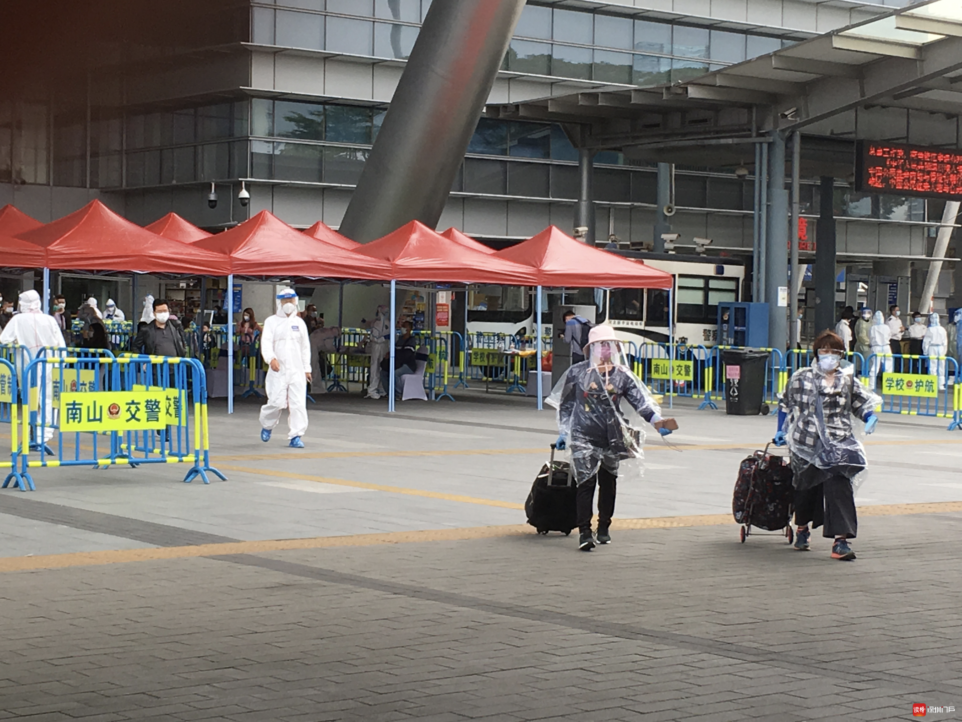 “排隊(duì)排了好幾個(gè)小時(shí),終于出來了!”頭戴帽子、護(hù)目鏡和口罩,外加一襲透明“雨衣”的趙女士把自己包裹得嚴(yán)嚴(yán)實(shí)實(shí),走到深圳灣口岸北廣場(chǎng)外才把帽子摘了,額頭微微出汗。她告訴記者,上午10點(diǎn)鐘她從香港出境,直到下午2點(diǎn)才通關(guān)。香港居民鐘先生是一名大學(xué)生,因老家有事才入境,他比趙女士要幸運(yùn)一些,從11點(diǎn)開始通關(guān)的他花了2個(gè)多小時(shí)。