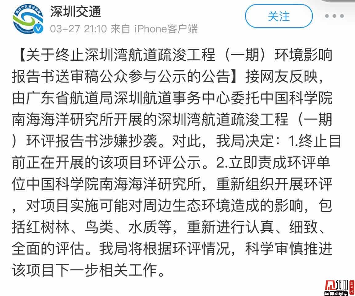3月27日21時(shí)10分,深圳市交通運(yùn)輸管理局官方微博發(fā)布消息稱:接網(wǎng)友反映,由廣東省航道局深圳航道事務(wù)中心委托中國科學(xué)院南海海洋研究所開展的深圳灣航道疏浚工程(一期)環(huán)評報(bào)告書涉嫌抄襲。對此,深圳市交通運(yùn)輸管理局決定:1.終止目前正在開展的該項(xiàng)目環(huán)評公示。2.立即責(zé)成環(huán)評單位中國科學(xué)院南海海洋研究所,重新組織開展環(huán)評,對項(xiàng)目實(shí)施可能對周邊生態(tài)環(huán)境造成的影響,包括紅樹林、鳥類、水質(zhì)等,重新進(jìn)行認(rèn)真、細(xì)致、全面的評估。深圳市交通運(yùn)輸管理局將根據(jù)環(huán)評情況,科學(xué)審慎推進(jìn)該項(xiàng)目下一步相關(guān)工作。