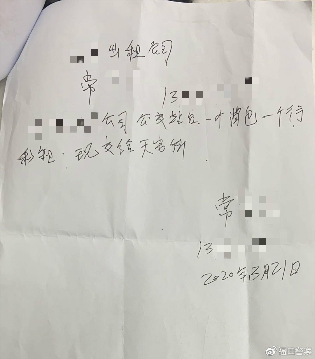 3月21日晚,一輛的士開到深圳市公安局福田分局天安派出所門口,的士司機(jī)從車上拿下來一個(gè)黑色的背包和銀色的行李箱到前臺(tái)。