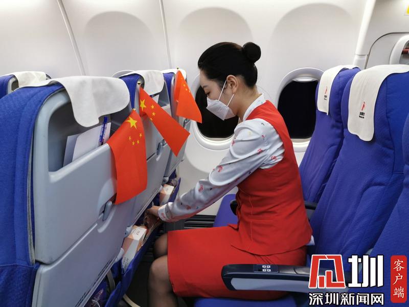 深圳航空乘務(wù)員為乘客準(zhǔn)備物資。