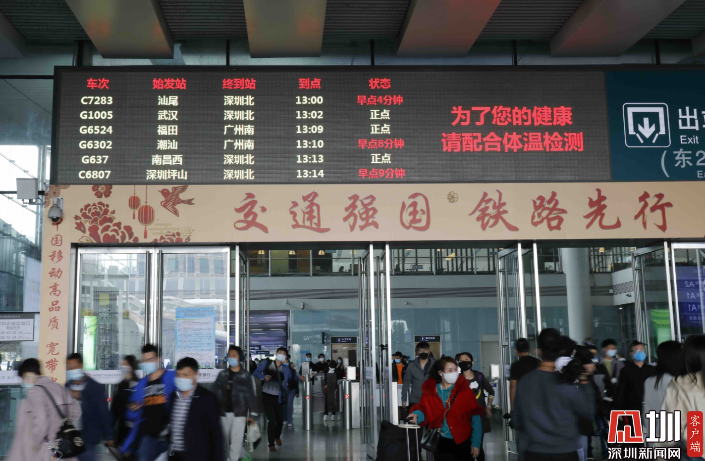 深圳北站東廣場(chǎng)出站口處,G1005車(chē)次在顯示屏上出現(xiàn)。