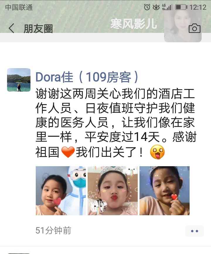 四是對確有特殊要求的隔離人員進(jìn)行個(gè)性化服務(wù)。住213的某先生從文萊回國因家里原因在隔離期間情緒波動(dòng)比較大,要求給他買10盒煙及啤酒,楊梅林了解到這一情況后,第一時(shí)間添加了客人的微信,只要一有空閑就找客人聊天并開導(dǎo)他不要有心理壓力,幾天下來,客人明顯開朗了很多,煙已經(jīng)很少抽了,啤酒一餐只喝一瓶,考慮到安全問題,每餐均被給楊梅林部分“退貨”了。還有401房單獨(dú)住了一位11歲的小女孩,劉群每天有空就給小朋友打電話,噓寒問暖,對入住酒店的特殊客人或帶小朋友的房間楊梅林和劉群服務(wù)的特別細(xì)致。她們常掛嘴邊的一句話是:隔離人不隔離愛,讓他們感受到家一樣的溫暖。