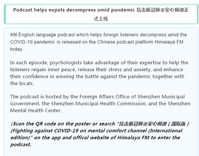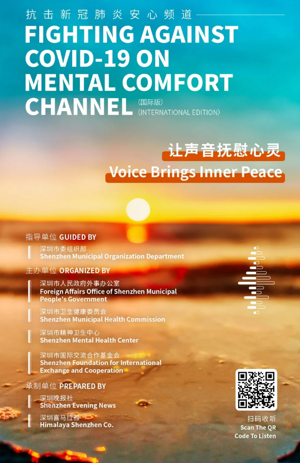 在疫情面前,每一份信念都意義重大,每一個希望都影響深遠。4月11日,抗擊新冠肺炎安心頻道(國際版)在喜馬拉雅 APP正式上線。該欄目在深圳市委組織部的指導下,由深圳市外辦攜手深圳市衛(wèi)健委、深圳市精神衛(wèi)生中心、深圳市國際交流合作基金會聯(lián)合出品,由深圳晚報和深圳喜馬拉雅共同承制。據(jù)悉,抗擊新冠肺炎安心頻道(國際版)是深圳市外辦首次聯(lián)合多部門協(xié)作,共同出品的全英文音頻欄目,也是繼"抗擊新型肺炎安心手冊音頻版"推出以來的又一大創(chuàng)新。該欄目的推出體現(xiàn)了深圳對中外居民的人文關懷,也展現(xiàn)了深圳作為國際化城市的溫暖大愛。