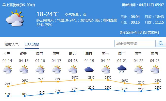 見圳客戶端·深圳新聞網(wǎng)2020年4月14日訊 據(jù)深圳市氣象臺預(yù)測,14日我市多云間陰天;氣溫18-24℃;東北風(fēng)2-3級;相對濕度35%-75%,全市森林火險黃色預(yù)警信號生效中。今天比較適合早晚清涼中午稍熱的夾心搭配,出門須做好防曬。