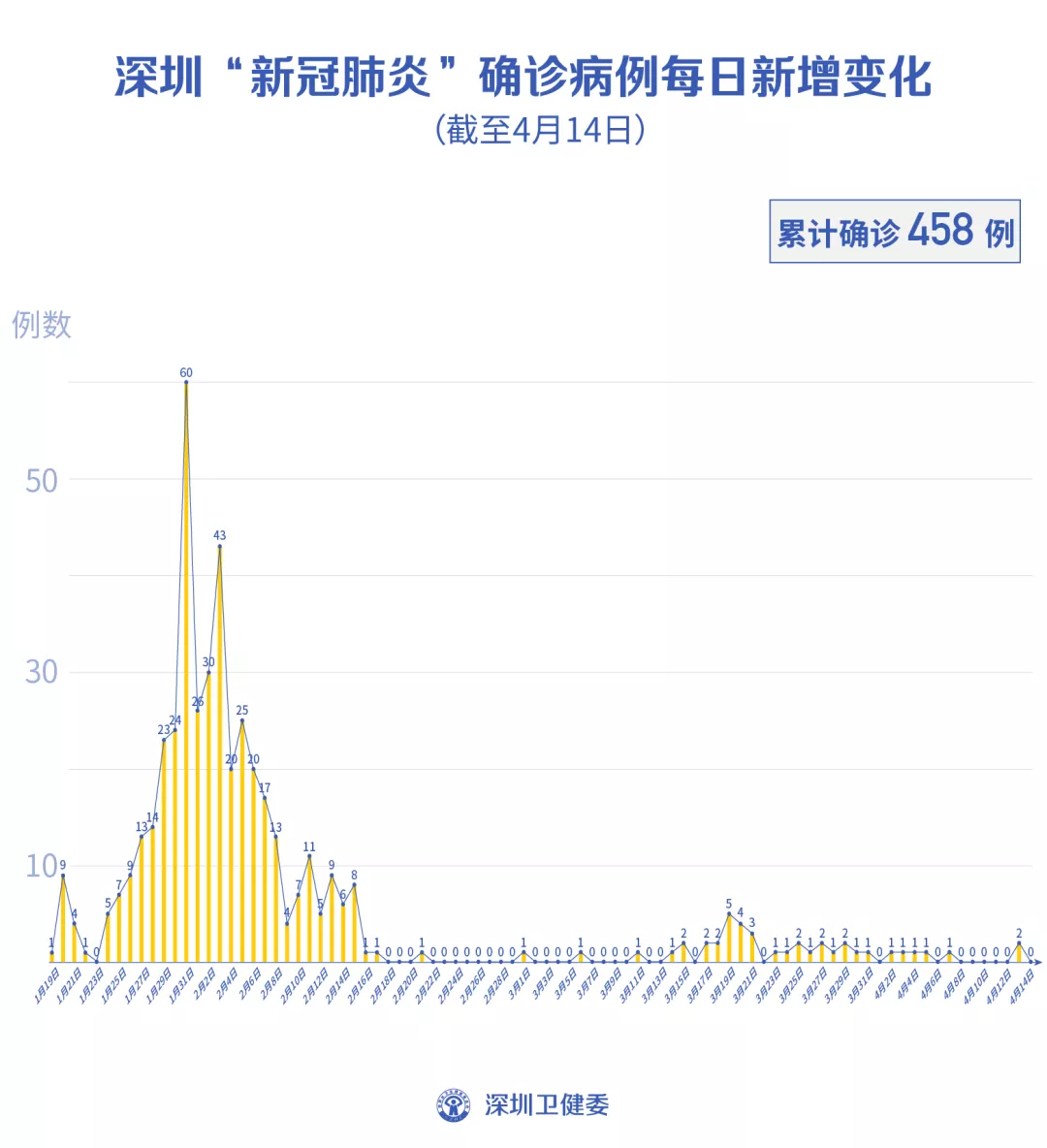 截至4月14日24時,深圳累計報告新冠肺炎病例458例。4月14日當天新增出院3例。