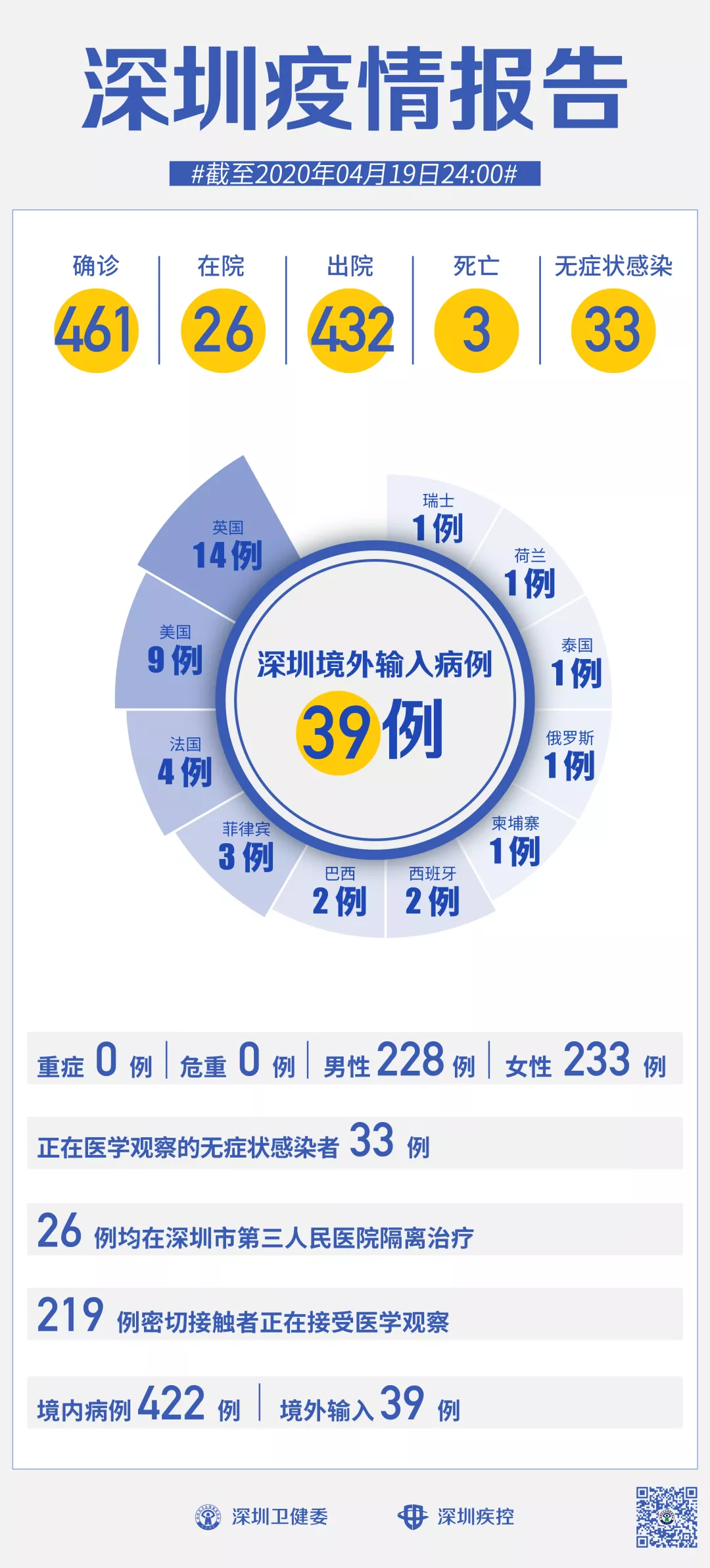 截至4月19日24時(shí),深圳累計(jì)報(bào)告新冠肺炎病例461例。4月19日當(dāng)天新增無癥狀感染者2例,出院1例。