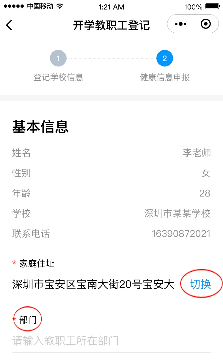 請根據(jù)實際情況完成健康信息申報,包括選擇家庭住址、填寫所在部門、申報健康情況。