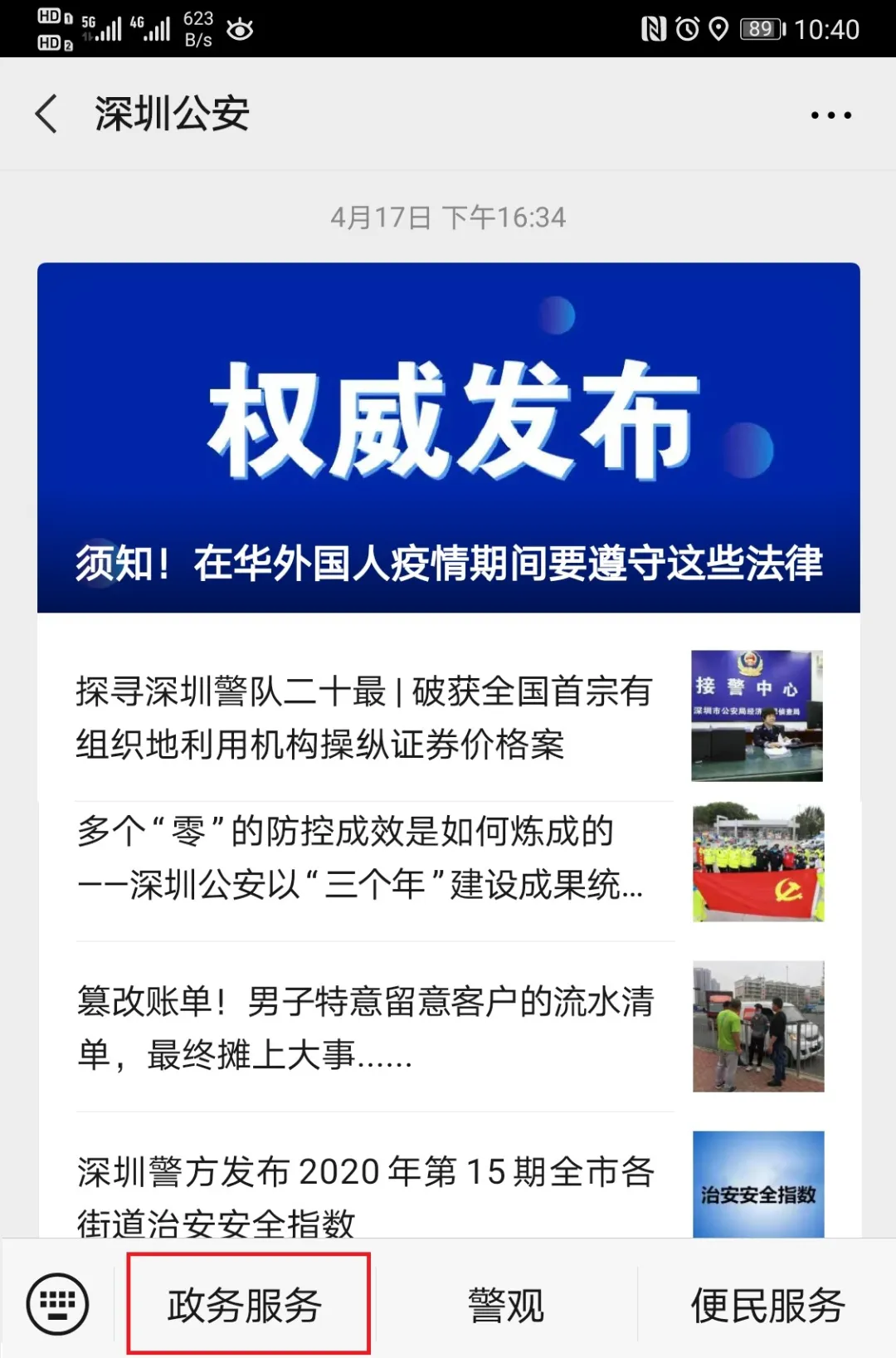 1、關(guān)注“深圳公安”,點(diǎn)擊“政務(wù)服務(wù)”;