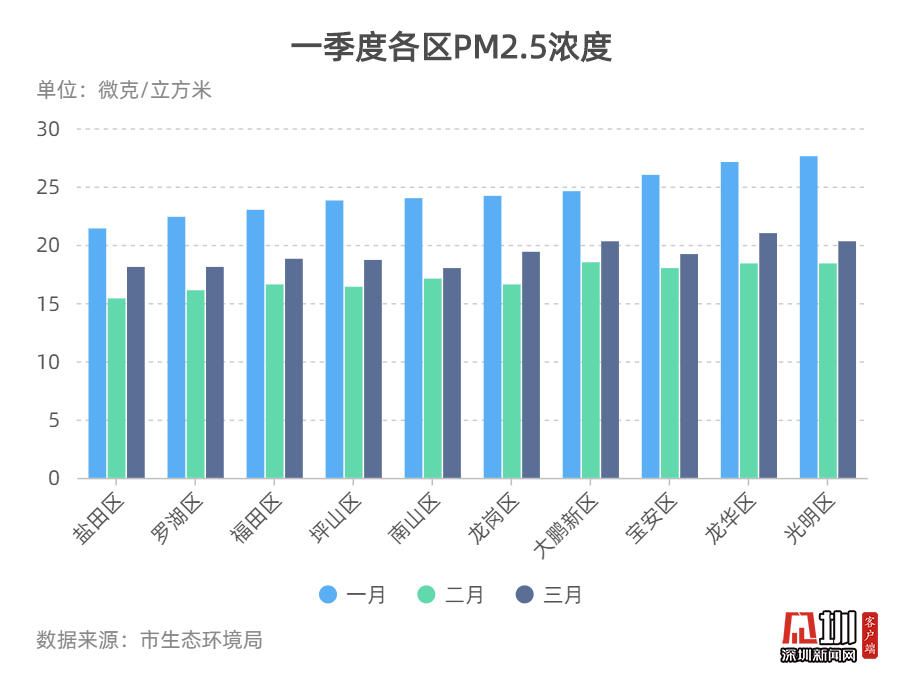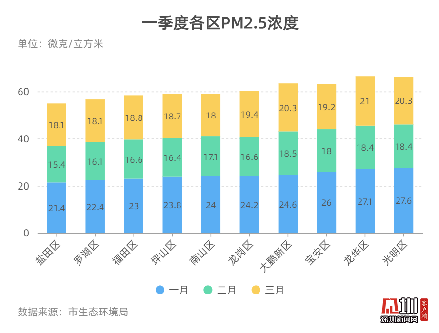2020年一季度整體數(shù)據(jù)顯示,各區(qū)一月份的PM2.5濃度數(shù)值相對較高,二月份均有所下降,三月份數(shù)值又有所回調(diào)。羅湖區(qū)和鹽田區(qū)空氣質(zhì)量排名連續(xù)位列三甲,而光明區(qū)空氣質(zhì)量排名連續(xù)位于末端。