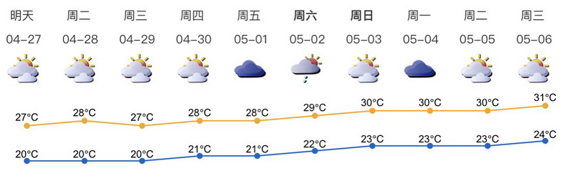 市氣象局預(yù)計,深圳未來一周天氣較平穩(wěn),氣溫逐日上升:周一至周三(27-30日)陽光增多,氣溫回升,溫暖干燥,周五至周日(5月1-3日)多云間陰天,早晚有輕霧,間中有分散陣雨。