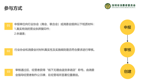 申請(qǐng)通過后,經(jīng)營(yíng)者即可獲得“線下無理由退貨承諾店”稱號(hào),具體參與方式見下圖。