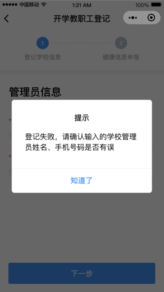 ②點(diǎn)擊“馬上登記”按鈕,填寫學(xué)校管理員姓名和手機(jī)號碼(學(xué)校管理員姓名和手機(jī)號碼請?jiān)儐枌W(xué)校獲得)后點(diǎn)擊“下一步”,然后選擇對應(yīng)的學(xué)校。