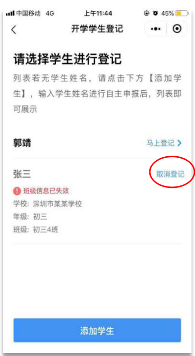對于已完成開學(xué)登記的師生,如開學(xué)登記頁面顯示學(xué)校信息或班級信息已失效,或選錯(cuò)登記人員時(shí),請取消此條登記記錄,重新進(jìn)行開學(xué)登記。取消成功后,原申報(bào)的師生健康卡信息將會失效。以下操作步驟以學(xué)生登記為例,具體如下: