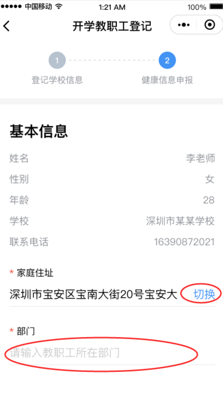 ③完成健康信息申報(bào),包括選擇家庭住址、填寫所在部門、申報(bào)健康情況等,請勾選申報(bào)承諾,點(diǎn)擊“生成師生健康碼”即可完成健康申報(bào)。