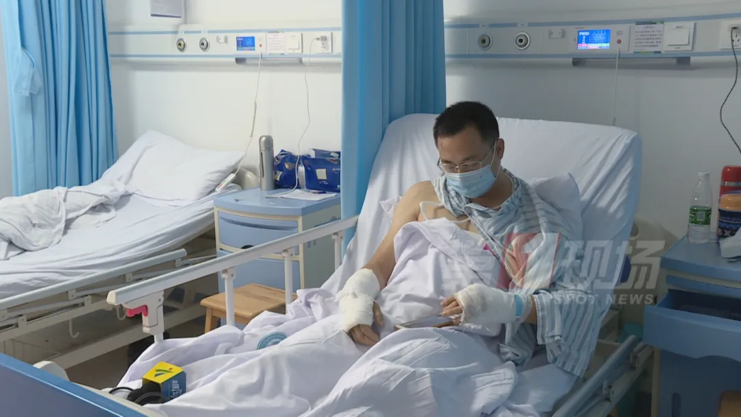 記者在病房見到了救人受傷的黃師傅。他說當(dāng)時一心只想著救人,忽略了做好安全措施。