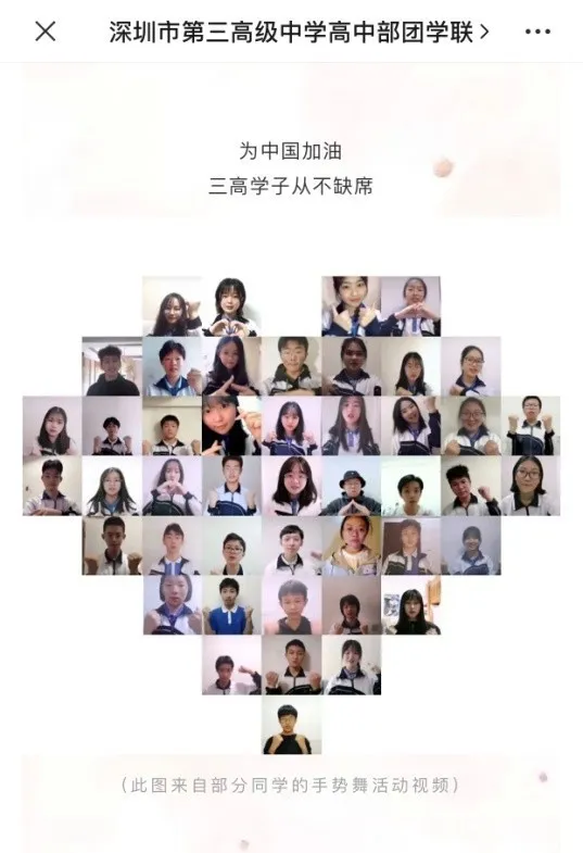 深圳市第三高級(jí)中學(xué)團(tuán)委的龐聰老師和同學(xué)們一起錄制了手勢(shì)舞《不放棄》,為抗疫一線吶喊加油!活動(dòng)先由龐聰老師和團(tuán)委學(xué)生聯(lián)合會(huì)的同學(xué)們策劃、學(xué)習(xí)、錄制、剪輯、審核,共同制作第一支手勢(shì)舞視頻。2月22日,他們?cè)诰W(wǎng)上發(fā)起手勢(shì)舞接力,收到上百名師生發(fā)來的接力視頻,經(jīng)過校團(tuán)委匯總、剪輯、發(fā)布,引起強(qiáng)烈的社會(huì)反響。龐老師說:“疫情無(wú)情,人間有愛,正是疫情讓我們緊緊地依靠在一起,手勢(shì)舞應(yīng)援雖不隆重盛大,但卻也凝結(jié)了我們師生對(duì)于疫情重地武漢的鼓勵(lì)與支持,對(duì)一線醫(yī)療工作者的無(wú)私奉獻(xiàn)的感謝?!?/p>