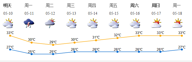 5月9日多云間晴天,局部有短時(shí)陣雨,氣溫27-32℃,中北部和人口密集區(qū)33-34℃;