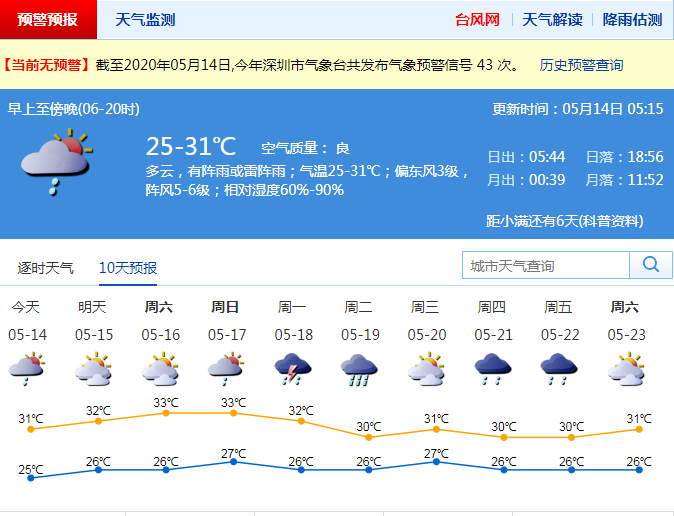 見圳客戶端·深圳新聞網2020年5月14日訊 還記得前兩天的強對流天氣嗎?目前仍是雷雨橫行的季節(jié),臺風還需往后靠靠,臺風未來兩天不會影響深圳。據市氣象臺消息,14日深圳以多云天氣為主,但仍有分散陣雨,大家外出記得帶傘,遮陽又能遮雨。