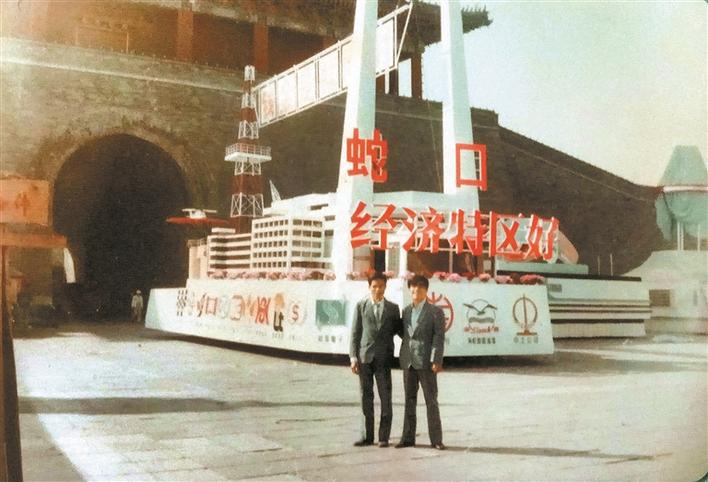 ▲李兆賢(左)與朋友在蛇口工業(yè)區(qū)彩車前合照。(照片翻拍)